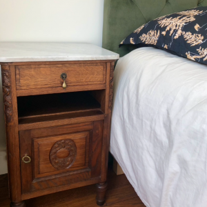 Aménagement des chambres mêlant mobilier ancien, vintage et contemporain. Valorisation de l'histoire singulière du lieu par une décoration contemporaine et un ameublement avec du mobilier chiné.