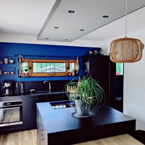 De A à Z, le rose se transforme en bleu. Objectif de cette chambre parentale: travaux et décoration. En premier, Changer la couleur, les murs, le sol, rester sur la même ligne de couleur que la maison. Le Bleu, Ici c'est un bleu canard à texture touché velours. Et sans oublier le bois. En deuxième, le confort pour un bon sommeil. "literie des alpes", @franceliterie . Tête de lit brique et tissu bouclé noir. Et linge de maison en pur coton. En troisième, ma petite touche personnelle, une décoration de seconde main, unique et personnelle. Comme, les Tables de chevet des années 90 en teck de sangapour. Elles ont bien voyagé. Le cadre avec une carte du summer palace de chine (souvenirs personnel d'un voyage en Chine) Et pleins d'autres petites pépites d'installées dans cette chambre.