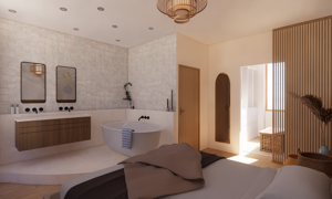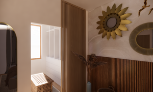 Transformer une chambre qui servait jusqu'à lors de dressing en chambre parentale avec un espace rangement et bureau, le tout dans des tons naturel de vert, de bois pour une ambiance apaisante et relaxante.