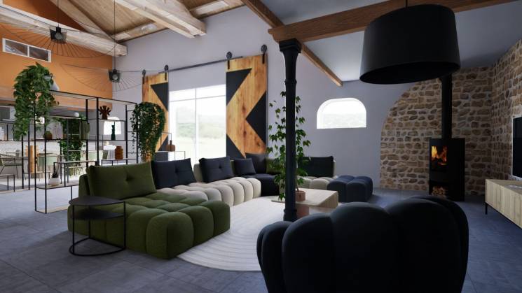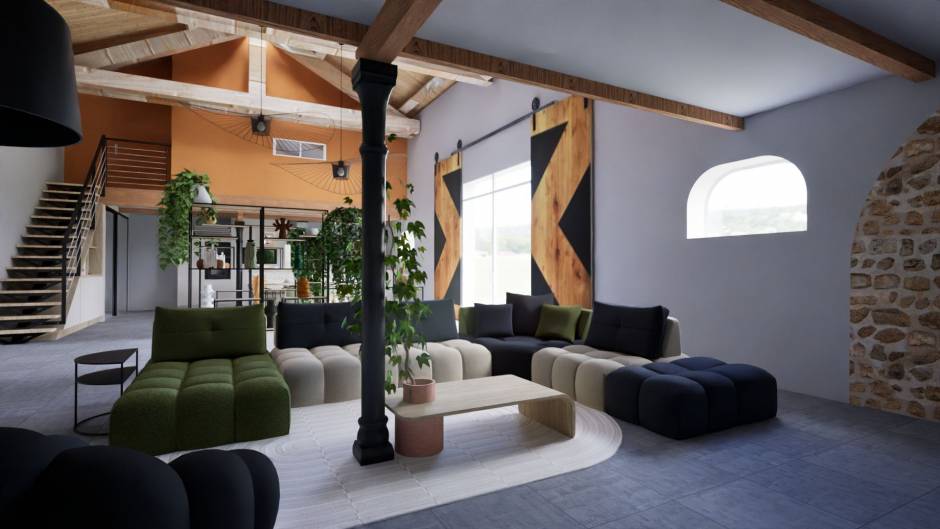 Décoration d'un loft vigneron. Contrainte piliers de soutien des mezzanines en position centrale difficile à aménager. Avantage du lieu trés beau plateau. Style choisi moderne.