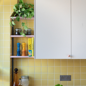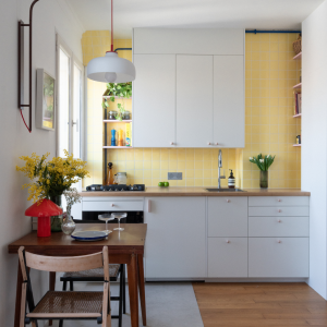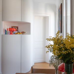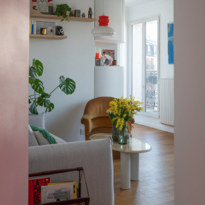 Pour ce projet, l’objectif a été de donner vie à cette pièce pour qu’elle soit en harmonie avec le style des clients. Dans une ambiance rétro et avec une optimisation des rangements, la salle de bain trouve sa place dans le reste de l’appartement. Le nouveau plan permet de libérer la circulation. L’utilisation de la porte vitrée d’origine permet de séparer l’espace bain et toilettes du salon.