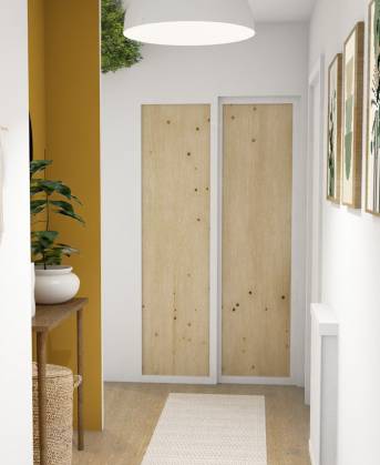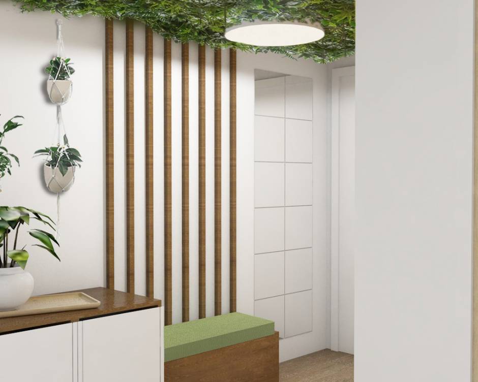 Le projet consistait à rendre l’entrée et le couloir d’un appartement plus moderne et vivant avec un petit budget. Ayant des animaux, il fallait l'adapter notamment par les caisses de nourritures à dissimuler ainsi que l'implantation de panneaux végétaux fixés au plafond. Les portes du placard ont été recouvertes. Un pêle-mêle de miroir a été ajouté pour agrandir cette entrée. L’espace reculé dans le couloir est utilisé pour l’emplacement de la console existante et accentué d'un ton ocre. L’idée de banquette dans l’entrée a été conservée et installée en enfilade avec le nouveau meuble/coffre pour le stockage de nourriture. On retrouve également la couleur ocre sur le mur d’entrée pour réchauffer l’espace. Le bois et le végétal sont les deux matériaux de cette rénovation.