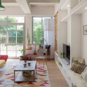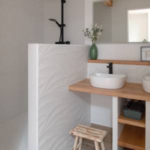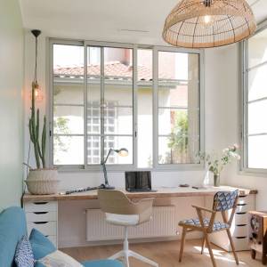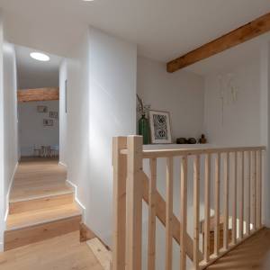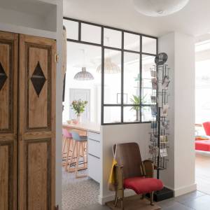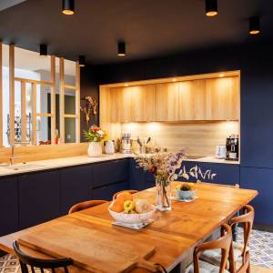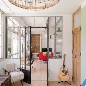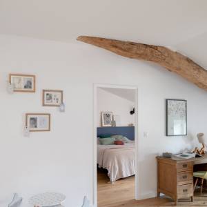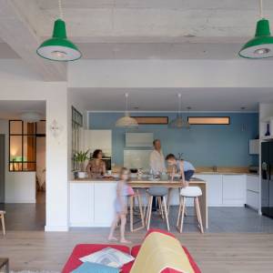 Conception du plan, schéma directeur des transformations futures, et réalisation de la 1ère tranche de travaux dans le cadre de la rénovation d'une maison ancienne (19è siècle) pour l'adapter à la vie d'une famille moderne. Travaux de modernisation du rez-de chaussée : cuisine, sablage des poutres, meuble sur-mesure sous escalier...