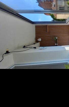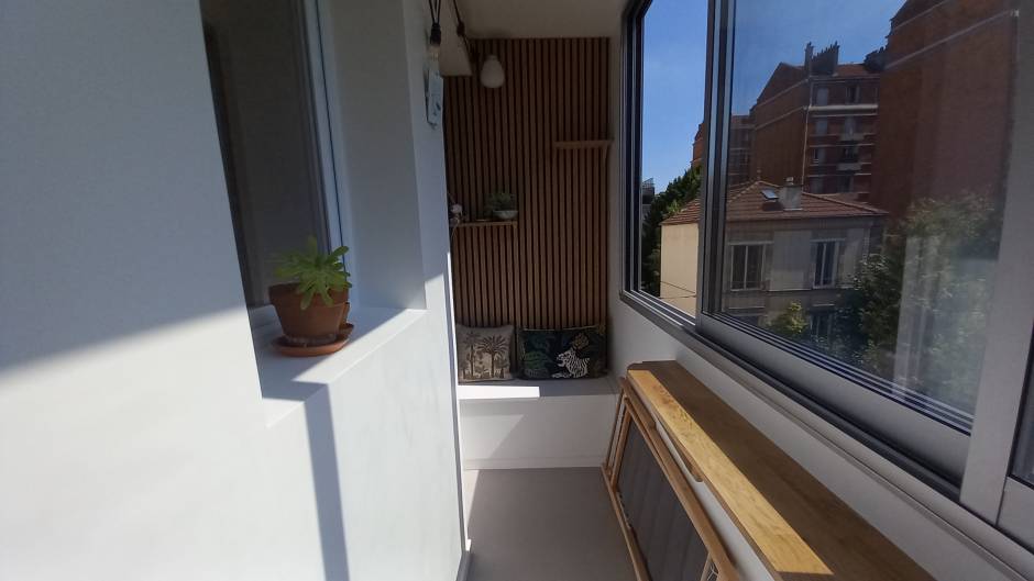Aménagement d’une loggia-débarras de 3 m², initialement utilisé comme débarras, pour en faire un espace fonctionnel et agréable, dédié au télétravail ou à une pause café. Objectif Valoriser un espace exigu en le transformant en un lieu accueillant et convivial, apportant confort et praticité au quotidien. Particularités du projet Fermeture de la loggia par des fenêtres coulissantes, améliorant l’isolation et l’usage en toute saison. Création de coffres de rangement sous les assises, optimisant chaque mètre carré. Habillage des murs en tasseaux de bois, pour un effet chaleureux et contemporain. Choix harmonieux des couleurs pour agrandir visuellement l’espace et renforcer le confort. Installation d’un petit bar pour prendre un café ou déjeuner sur le pouce.