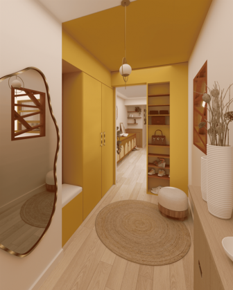 Pour ce projet, l’objectif était d’aider ma cliente à poser ses idées d’aménagement sur un plan 2D et à se projeter grâce à des visuels 3D, même si les travaux ne seront réalisés que bien plus tard. Nous sommes donc partis de ses envies, de son mode de vie et des contraintes existantes pour imaginer des ajustements simples, cohérents et optimisés. ✨ Dans l’entrée, la circulation a été clarifiée : le passage vers la cuisine est repensé avec une verrière, permettant de garder le lien visuel et la lumière entre les deux pièces tout en apportant davantage de structure. ✨ La cloison entre la cuisine et la pièce de vie accueille désormais une ouverture à mi-hauteur avec bar intégré, créant un accès direct et une transition plus fluide entre les espaces. ✨ Côté salon, l’idée forte est d’ouvrir le volume en supprimant la cloison du couloir. Cela permet d’agrandir la pièce, de faire circuler la lumière et d’intégrer sur-mesure les poteaux porteurs, transformés en atouts plutôt qu’en contraintes. L’ensemble propose une vision harmonieuse, chaleureuse et évolutive du futur intérieur — un projet pensé pour accompagner les besoins de ma cliente, tout en restant réaliste et adaptable dans le temps.