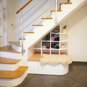Un optimisation totale de l'espace en utilisant l'encadrement de la porte de l'entrée pour y placer un meuble sur-mesure