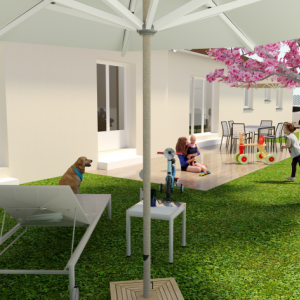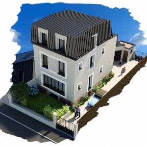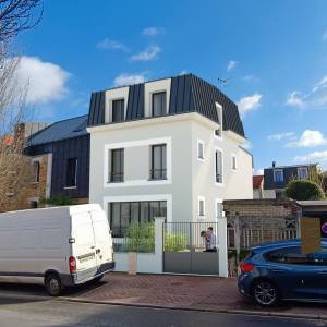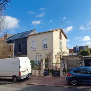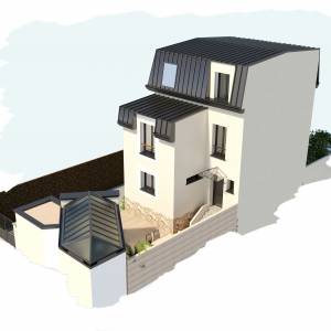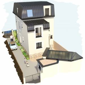 Réhabilitation complète d'une maison de ville : Isolation complète par l'extérieur, réaffectation des espaces intérieurs, création d'un bureau surmonté d'une terrasse accessible depuis la cuisine. L'habillage du toit et du rdc avec un bardage