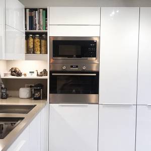 La grande cuisine avec les meubles du couleur gris claire fait cette pièce plus spacieuse et les étagères en bois nous donnent un style plus moderne.