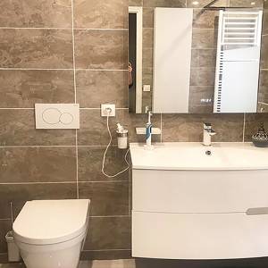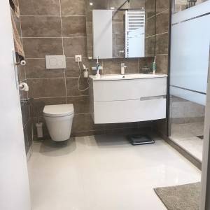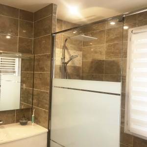 Pour la salle de bain, la douche italienne avec le revêtement mural dans les tons beige et gris créent une déco moderne et naturelle à la fois,