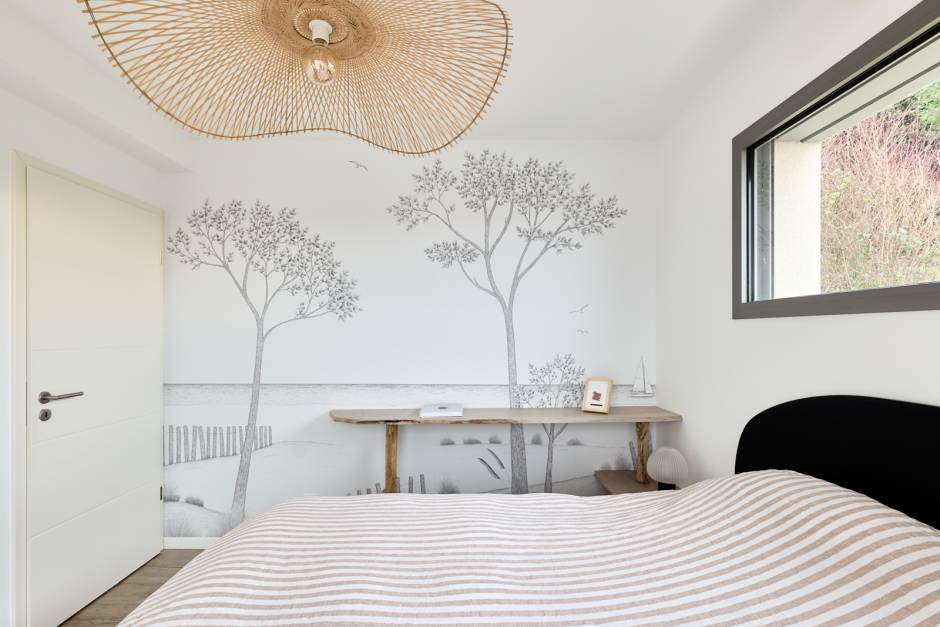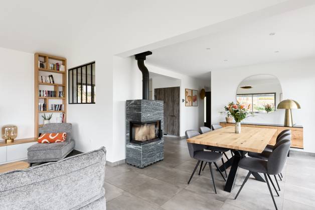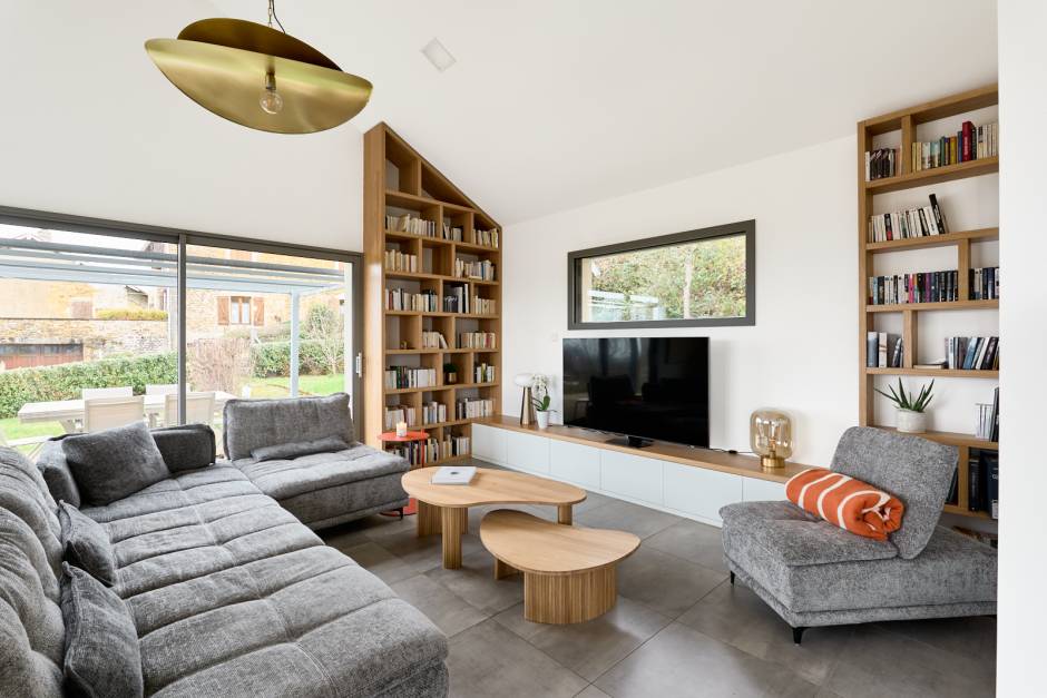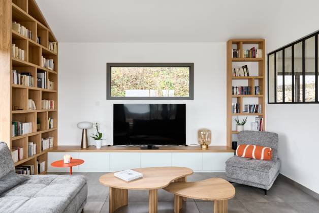 Ce projet d’aménagement intérieur a consisté à repenser plusieurs pièces d’une maison récemment acquise afin de créer un intérieur chaleureux, fonctionnel et harmonieux. Le salon a été structuré autour d’une bibliothèque sur mesure, tandis que la salle à manger a été aménagée pour favoriser la convivialité et la lumière. La cuisine a été modernisée sans être totalement remplacée, grâce à des interventions ciblées : nouvelle faïence, luminaires, cave à vin intégrée et finitions soignées. La chambre a été transformée en espace apaisant grâce à un papier peint panoramique, et le dressing a été conçu sur mesure avec rangements optimisés et éclairage LED intégré. Enfin, la salle de bain a été réaménagée pour mieux répondre aux contraintes d’espace avec un meuble simple vasque et une paroi de douche adaptée. Un projet global pensé pour allier esthétique, confort et fonctionnalité au quotidien.
