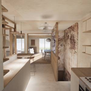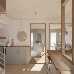 AMÉNAGEMENT D’UN FOURGON AMÉNAGÉ Optimiser un mini-espace Lier l’esthétique, le fonctionnel et la technique : voilà le challenge correspondant au cahier des charges de ce véhicule de 5 m de long et 2,5 m de hauteur. L’ambiance souhaitée par l’architecte a été de créer un contraste entre le contenant extérieur noir et son contenu intérieur en blanc et en bois. L’idée était également de rapporter un maximum de lumière et de vues possibles vers l’extérieur, d’où la pose d’un lanterneau en toiture, d’une fenêtre sur la porte latérale et de deux fenêtres sur les portes arrière. La hauteur sous plafond et la disposition des meubles permettent de pratiquer l’espace en étant debout, assis ou allongé. La mini-surface se compose de la partie meuble bas/circulation et de la partie canapé-table ou lit selon le choix. Une tablette a été fixée sur le côté du meuble lavabo afin de pouvoir cuisiner dehors lorsque la porte latérale est ouverte. Il est aisé d’accéder aux toilettes sèches et aux réserves d’eau, d’allumer le chauffage, de passer devant si besoin par la trappe située entre la partie conducteur et la partie arrière. Une batterie auxiliaire, placée judicieusement sous les assises, est reliée à l’électricité intégrée dans le complexe ossature bois et isolation, elle-même posée au niveau du sol, des parois et du plafond.