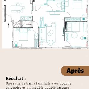 Aménagement d'une maison neuve dans les Landes. Etude et analyse des habitudes de vie, et des souhaits de l'ensemble des membres du foyer pour optimiser le potentiel des lieux. Réalisation d'une entrée avec un effet "boîte" verte. Le claustra crée à la fois une séparation et une ouverture vers le salon/salle-à-manger. La cuisine offre beaucoup de rangement et un îlot convivial pour les soirées familiales et entre amis.