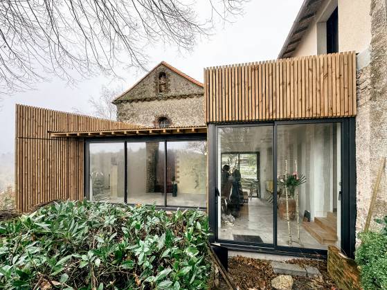Entièrement réalisée en ossature bois et sur pilotis, l’extension compose avec la déclivité générale du terrain. Telles des cabanes perchées abritant chacune une fonction distincte, les trois volumes principaux fragmentés et suspendus donnent une impression de légèreté en contraste avec les masses des bâtiments anciens. Le bardage bois à claire-voie révèle ces parties existantes en pierre, et se distingue par sa teinte naturelle et chaleureuse. À l’extrémité de chaque entité, les toitures monopentes s’élèvent vers le grand paysage, et les baies vitrées généreuses en aluminium anthracite orientent chaque pièce vers les vues souhaitées, en direction du coteau boisé et de la Sèvre Nantaise en contrebas.