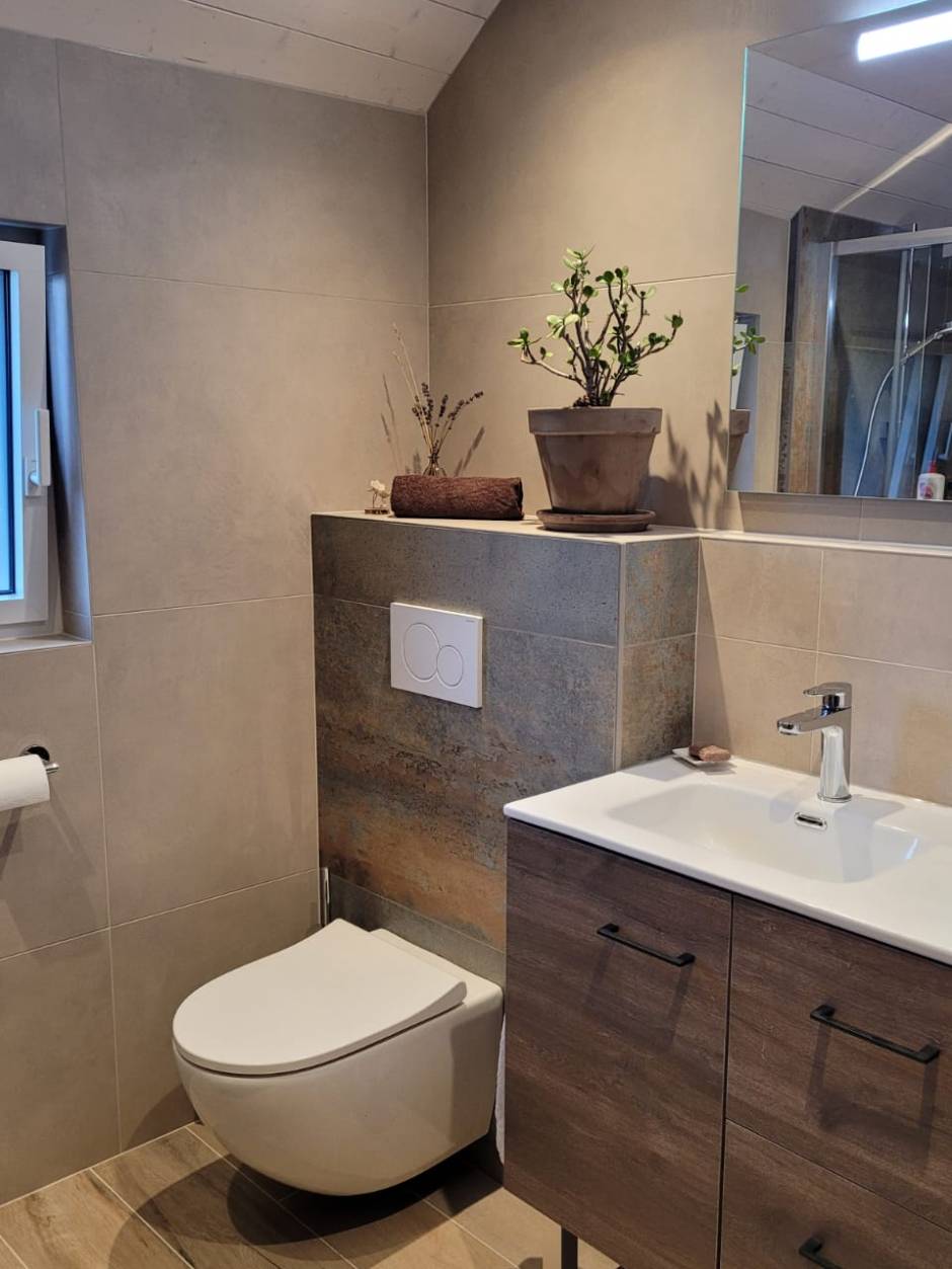 Salle d’eau master. Le mélange des matières, des styles avec un sol aspect bois et les murs en aspect oxyde. Jouer sur le naturel et le brut. #abk #carrelage #faience #architectedinterieur