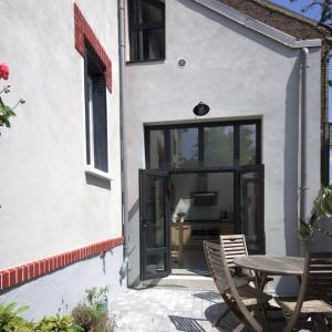 Le projet a consisté à déposer les combles existantes afin de surélever la maison et créer un étage. Le parti pris a été de donner à la surélévation une expression contemporaine afin de créer un dialogue avec la maison existante ancienne en meulière. Ce dialogue permet de mettre en avant le caractère d’époque de la maison. L’intérieur a été entièrement rénové afin de répondre aux besoins d’une famille avec enfants.