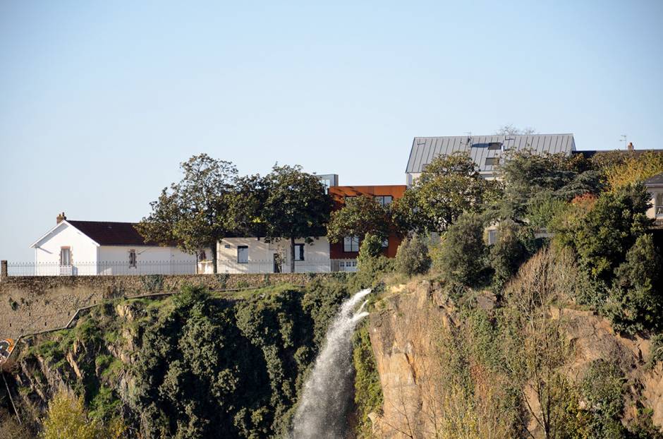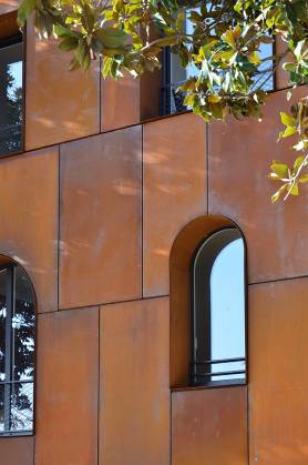 - La façade sur rue, reprenant le thème de la fenêtre cintrée et la couleur rousse des pierres du soubassement, allie une expression contemporaine, des teintes naturelles, et un dessin respectueux des formes initiales. Sur jardin, la surélévation reçoit un bardage bois et une grande fenêtre panoramique cadrant le lointain.
