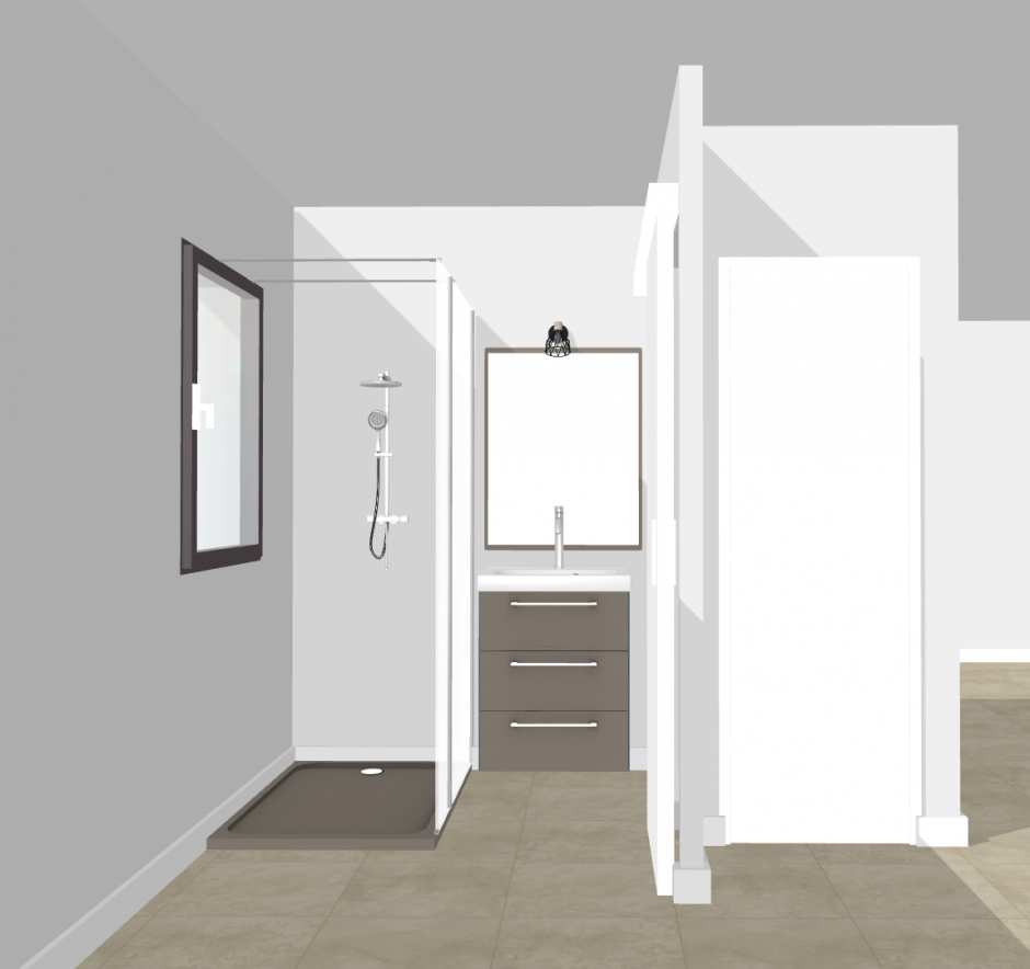Agrandissement et rénovation d'une petite salle d'eau. L'idée était d'agrandir de 2m2 cette petite salle d'eau en de déplaçant la cloison (non porteuse) du placard de la chambre d'ami accolée. J'ai remplacé la porte initiale par une porte coulissante pour un gain de place maximum. Du coup j'ai pu agencer la douche plus en profondeur ainsi que le lavabo pour un gain de place maximum. Un joli papier peint sur le mur gauche, ainsi que dans le couloir apporte continuité et agrandisse l'espace.