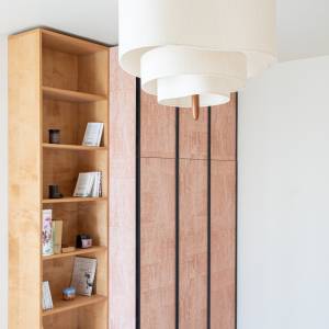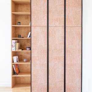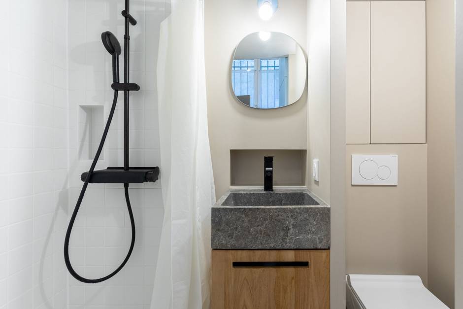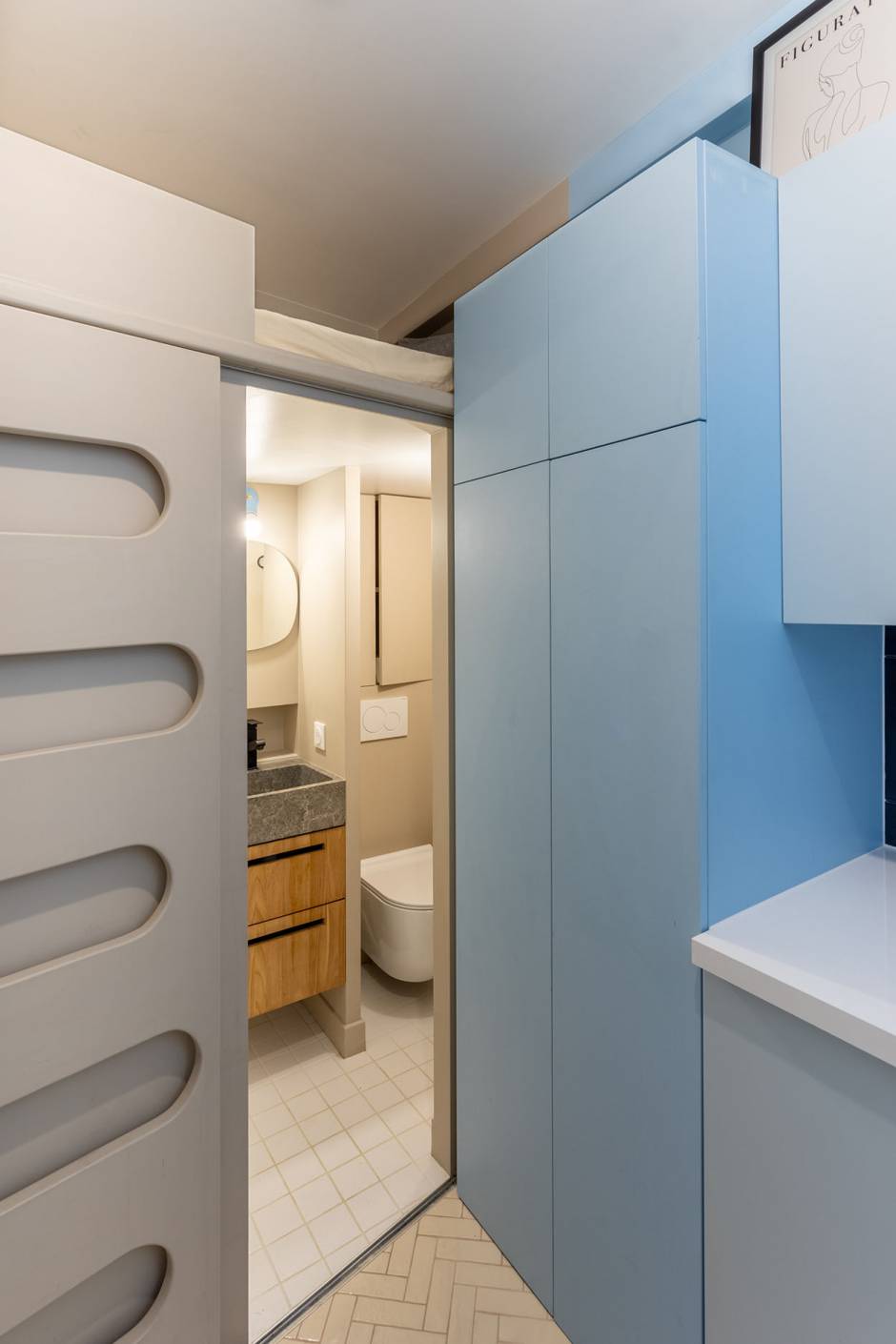 Dans un espace de 7 mètres carré, le propriétaire m’a mise au défi d’intégrer un couchage de 120 cm, une douche, un WC, un espace cuisine. Grâce à une hauteur sous plafond de 2m85, il a été convenu de créer une mezzanine pour acceuillir la partie couchage et créer ainsi la salle d’eau en dessous. Dans l’espace restant nous avons installer la cuisine et aménager un placard.