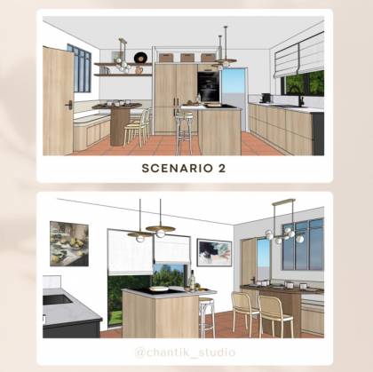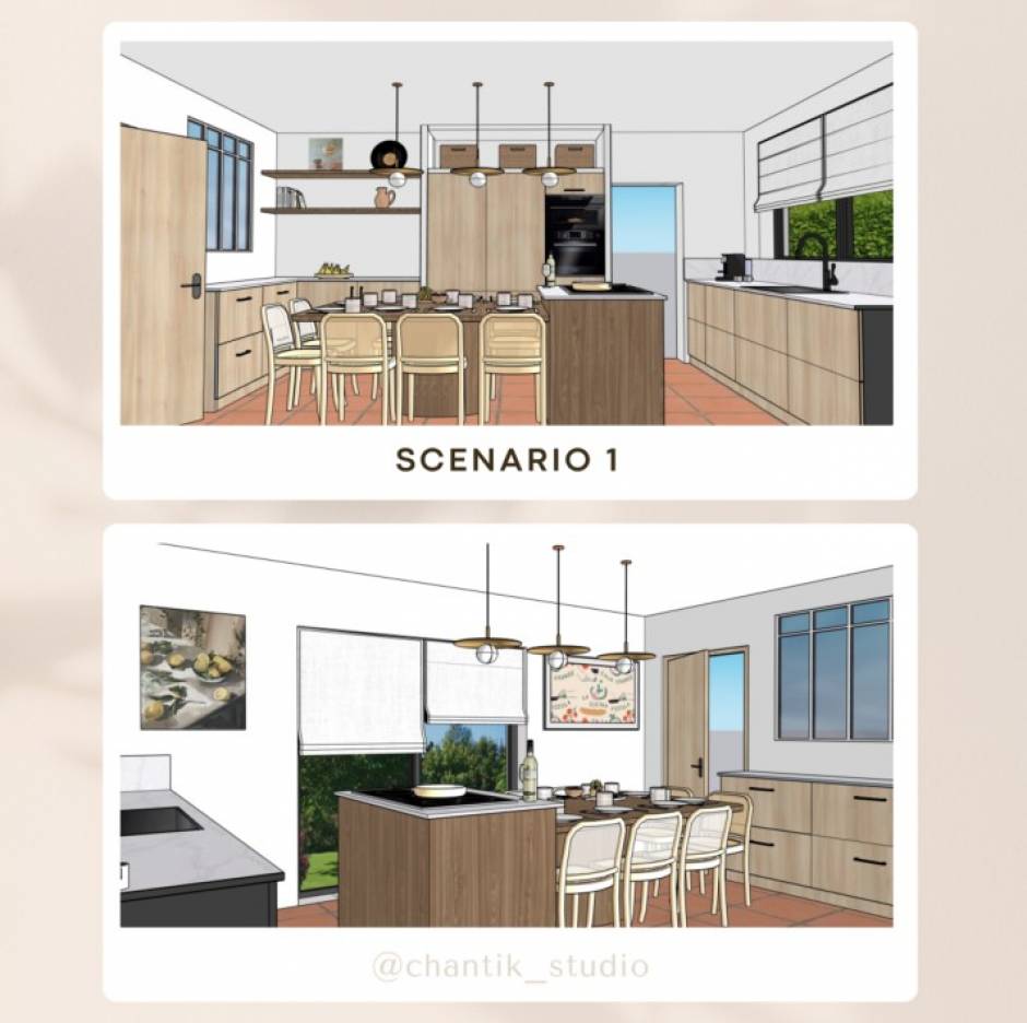 Contexte : Notre cliente souhaitait rénover sa cuisine actuelle agéé de plus de 20 ans en une cuisine fonctionnelle, adaptée à la vie quotidienne et à la convivialité. L’îlot central, élément clé de cette rénovation, a été pensé pour allier praticité et design. Avant : Une cuisine fermée, peu lumineuse, qui ne répondait plus aux besoins actuels. Après : Une transformation complète avec des lignes épurées, des matériaux durables et l’ajout d’une cloison vitrée entre la cuisine et la salle à manger, offrant ainsi plus de lumière naturelle et une sensation d’espace, tout en conservant une structure organisée. Deux configurations ont été étudiées pour l’îlot central : Option 1 : Prolonger l’îlot avec une table de hauteur classique, combinant praticité et élégance dans un même ensemble. Option 2 : Prévoir un îlot plus compact, idéal pour les repas rapides et les apéritifs, associé à un espace repas séparé pour plus de confort. La conception du projet a été entièrement conçu à distance.
