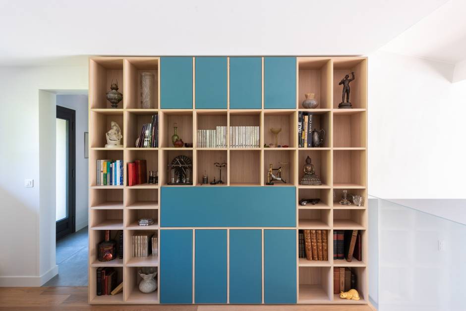 Il a donc s’agit de décloisonner le séjour, noyau de la maison, de créer des mobiliers sur mesure. Ces mobiliers sur mesure forment le lien entre les espaces et répondant à de nouveaux usages (bibliothèques, meubles TV, table de cuisine évolutive…) Autant de réponses et d’adaptations qui offrent aux occupants des espaces plus adaptés à leur façon d’habiter sans dénaturer les volumes et le caractère du bâti existant.
