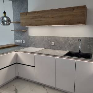 La décoration a été choisie dans des matériaux nobles, avec l'emploi de marbe blanc, et de touches de bois massif.