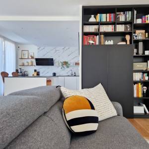 Rénovation totale et réagencement d’un appartement de 95 m². L'intégralité de l'appartement a été repensé et certains espaces ont été redistribués, dont la cuisine qui a été déplacée dans la pièce de vie. Conception des meubles sur-mesure, accompagnement dans le choix des matériaux, revêtements et mobiliers.