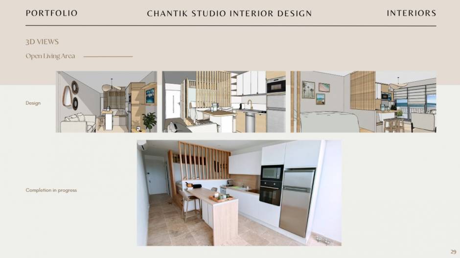 Ce projet concerne la rénovation complète d’un studio de 28 m² (8 m x 3 m), orienté sud-est, comprenant une cuisine/salon, une chambre, une salle de bains et des WC séparés. Le couple propriétaire souhaite un pied-à-terre élégant et fonctionnel pour leurs séjours et des locations saisonnières via Airbnb. Objectifs du projet : Fonctionnalité & optimisation : Aménagement fluide et pratique, maximisation des rangements et circulation, cuisine ouverte avec petite île centrale, salle de bains rénovée, équipements essentiels intégrés pour la location saisonnière. Esthétique & confort : Intérieur minimaliste et lumineux, palette douce (blanc, beige), matériaux naturels (bois clair, travertin, textiles lin et coton), ambiance cosy et élégante rappelant la douceur de la mer. Durabilité : Matériaux résistants aux conditions côtières, finitions haut de gamme, espace durable et facile à entretenir malgré les rotations fréquentes de locataires. Concept décoratif : Cozy Seaside Un intérieur lumineux et accueillant, combinant simplicité, confort et charme côtier, où chaque détail contribue à une atmosphère apaisante et raffinée.