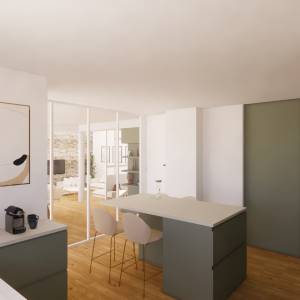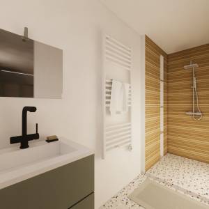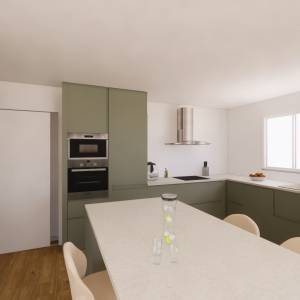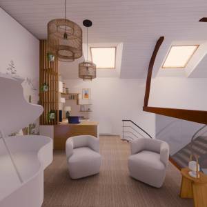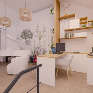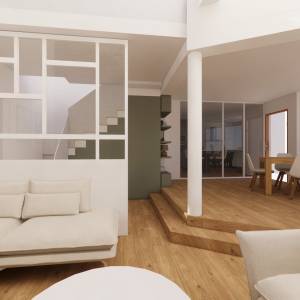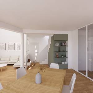 Tout l’enjeu de ce projet a été de créer une seule et belle pièce de vie incluant entrée / cuisine / salle à manger / salon tout en gardant des espaces fonctionnels bien définis. L’espace a été repensé de manière à optimiser toute la surface disponible et à apporter un maximum de lumière. Pour cela, la porte d’entrée a été changée, un claustra a été installé pour laisser passer la lumière tout en créant une séparation entre l’entrée et le salon. La baie vitrée du salon a été agrandie et transformée en baie à galandage. La cloison de la cuisine a été supprimée pour laisser place à un petit îlot de rangement et coin repas pour le quotidien. La partie nuit a été séparée de la partie jour par une porte coulissante qui se glisse derrière l’escalier pour plus de praticité au quotidien. Quelle meilleure récompense que de voir briller les yeux de mes clients, heureux et épanouis de vivre dans leur nouvel intérieur parfaitement agencé pour eux.