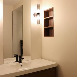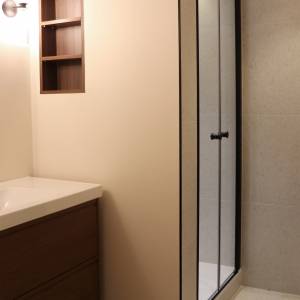 Pour ce premier achat, mes clients ont souhaité repartir sur de bonnes bases : l'appartement a donc été entièrement isolé pour améliorer ses performances énergétiques, conformément aux recommandations du DPE. Une fois l’enveloppe traitée, place au projet d’intérieur. L’intention : ramener de la lumière, optimiser chaque mètre carré et préserver le charme parisien existant. Les sols d’origine sont conservés et rénovés, pour faire dialoguer le bâti ancien avec un aménagement plus contemporain. La pièce phare du projet : une verrière sur-mesure, réalisée par un artisan parisien. Son verre flûté voile la salle d’eau tout en laissant la lumière du sud baigner cet espace immaculé. Le salon a été pensé comme un espace réversible, capable de s’adapter : recevoir, travailler, dîner ou dormir. Un paravent permet de masquer la cuisine lorsque celle-ci n’est pas utilisée. Résultat : une vraie sensation d’espace dès l’entrée, des circulations fluides et peu de cloisonnement visuel. Des usages clairement définis sans jamais alourdir la pièce de vie.