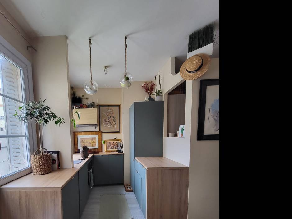 Rénovation d'un petit studio de 29m² pour lequel, l'idée était de le rendre chaleureux et accueuillant. Il a été entiérement décloisonné pour permettre de créer : Une entrée intégrant un coin bureau, un banc, un dressing et une commode. Une ouverture dans l'entrée à été faite pour amener la lumière provenant de la cuisine. Elle même ouverte sur le salon et out équipée. Un coin nuit a été crée et la salle de bain refaite à neuf.