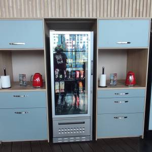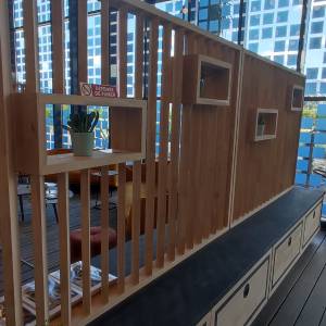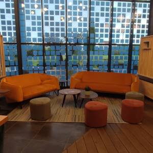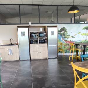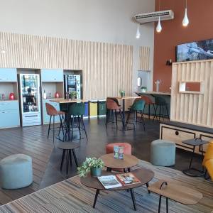 Transformation du rez de chaussée d'une maison d'habitation en bureau. Dans cet espace de 102m² nous y avons intégré 2 bureaux individuels, 2 bureaux collectif, un espace détente, un coin cuisine et une mezzanine pour l’archivage. Les couleurs sont assorties à celle du logo de l’assurance. Les matériaux sont essentiellement en bois