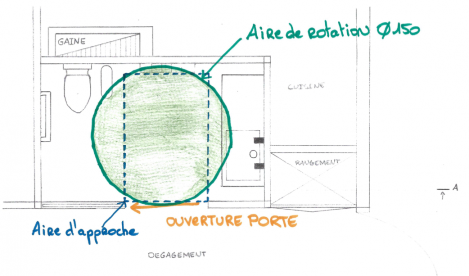 Aménagement d’un WC en WC PMR, en tenant compte des contraintes liées aux déplacements en fauteuil roulant.