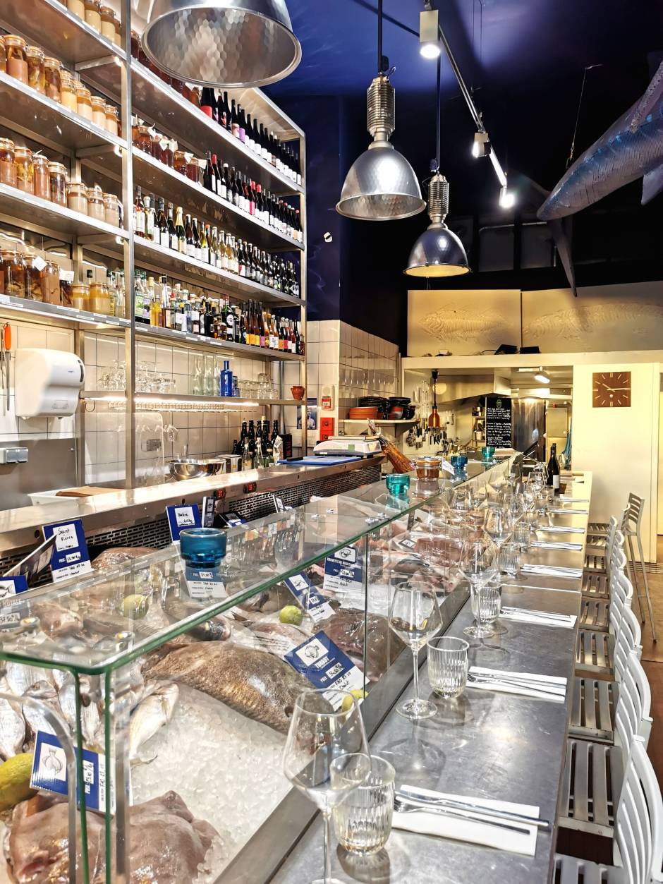 Dans ce volume longitudinal, la poissonnerie et le restaurant cohabitent en un parcours fluide, guidé par l’étal de glace et le bar central. L’acier inox, les reflets mouvants et la lumière bleutée composent une atmosphère immersive, comme une plongée sous-marine.
