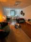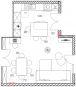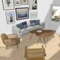 Après : Un canapé confortable et convertible pouvant servir de couchage d’appoint, une table basse ronde pour une circulation fluide, et la télévision conservée au même endroit pour une installation électrique facilitée.