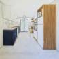 Après : Suppression du bar pour un îlot central où trois personnes peuvent manger, lave-vaisselle déplacé pour une meilleure circulation, un espace de 90 cm pour circuler autour de l’îlot, plan de travail ajouté entre l’évier et les plaques de cuisson, et rangements toute hauteur pour une grande capacité de stockage.