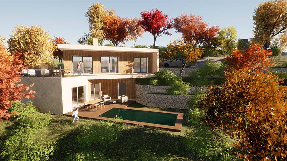 Conception d'une maison individuelle sur deux niveaux dont les angles sont calculés en fonction de la vue et de l'ensoleillement.