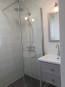 Agrandissement et rénovation d'une petite salle d'eau. L'idée était d'agrandir de 2m2 cette petite salle d'eau en de déplaçant la cloison (non porteuse) du placard de la chambre d'ami accolée. J'ai remplacé la porte initiale par une porte coulissante pour un gain de place maximum. Du coup j'ai pu agencer la douche plus en profondeur ainsi que le lavabo pour un gain de place maximum. Un joli papier peint sur le mur gauche, ainsi que dans le couloir apporte continuité et agrandisse l'espace.