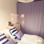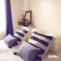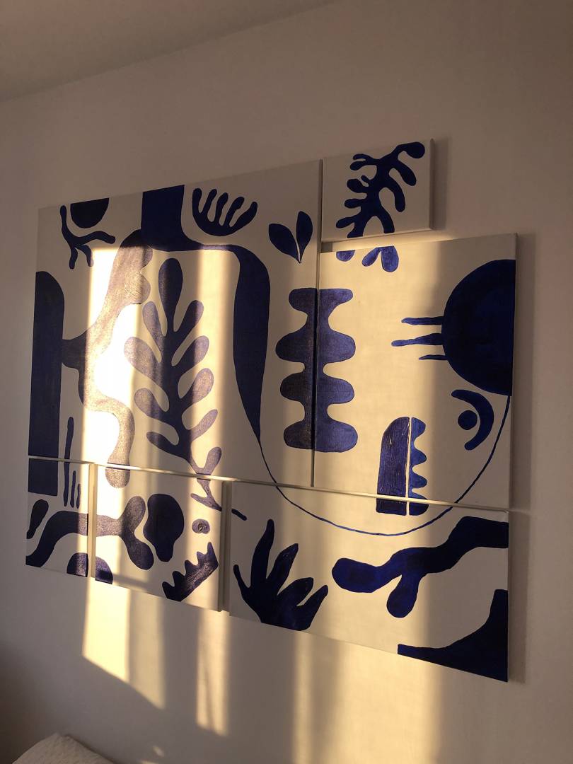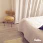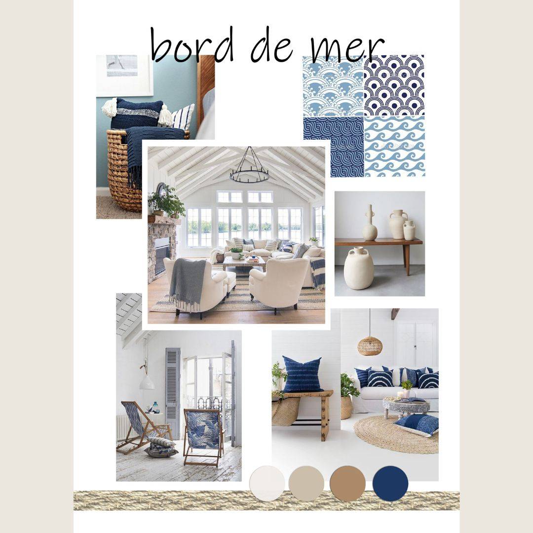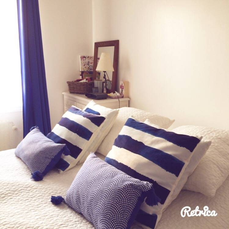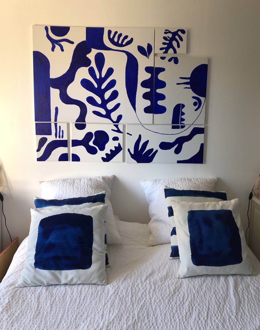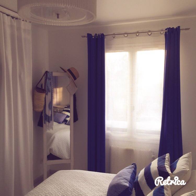 Aménagement et décoration d'une chambre parentale ambiance Bord de mer/ Grèce, choisit par mes clients. J'ai voulu tout d'abord éclaicir cette chambre qui était très sombre malgré qu'elle soit plein sud , en amenant beaucoup de blanc et en jouant avec les accessoires de couleur bleu Klein (rideaux, tableau...) pour apporter du contraste. Réalisation et conception d'un meuble à chaussures et sacs à main sur mesure pour ma cliente : 2M50 de long par 2M40 de haut avec rideaux blancs.(introuvable dans le commerce) Changement de parquet, choix d'un parquet blanc vieillit, pour encore plus de clarté et donner du cachet. Projet unique : réalisation d'une composition de tableaux par Maison Lunie, sur-mesure pour symboliser la tête de lit.