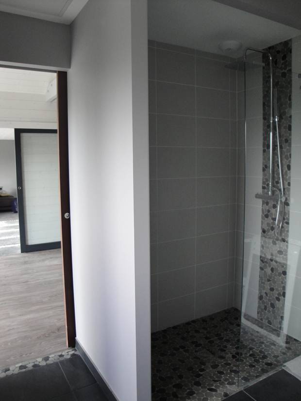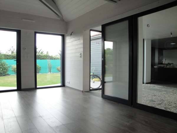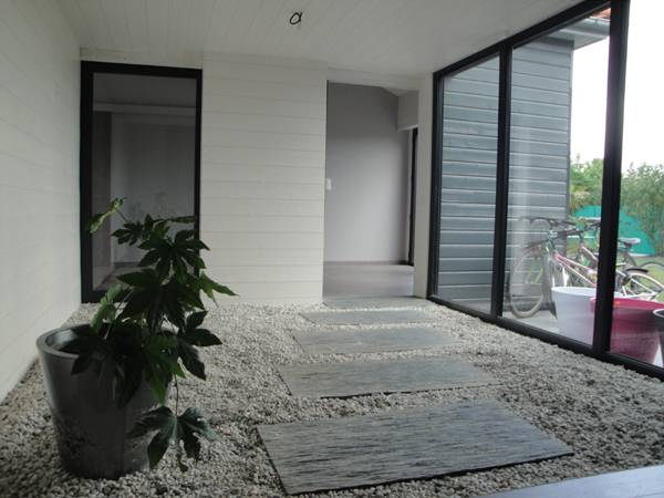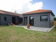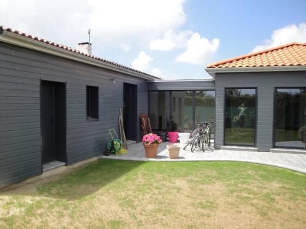 Le projet de mes clients consistait à agrandir leur résidence secondaire et améliorer leur confort intérieur par le biais d’une extension. Pour répondre à leur projet, je leur ai proposé de créer deux extensions : au sud, le Carport ainsi que la cuisine d'été en volumes ouverts reliés par les éléments structurels de la charpente, en restant cette fois-ci dans une structure plus traditionnelle. Et au nord, la suite parentale reliée par un patio avec une architecture contemporaine en rupture avec l’existant. Ce patio minéral et végétal permettra le lien entre le séjour de la maison existante et l'îlot abritant une chambre spacieuse, un dressing et une salle de bain. Le traitement avec un plafond plus bas que celui du séjour marque le passage à l'espace nuit. Ce patio a pour vocation également d'augmenter le volume du séjour, d'agrandir la perspective et d'apporter de la lumière. La chambre sera très ouverte sur le jardin et donnera le sentiment d'être isolée de la maison existante. Le volume de la chambre sera toute hauteur et fera apparaître le noeud de la charpente. Un lambris teinté gris, des portes coulissantes avec hublot donneront un aspect marin à cet espace.
