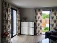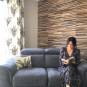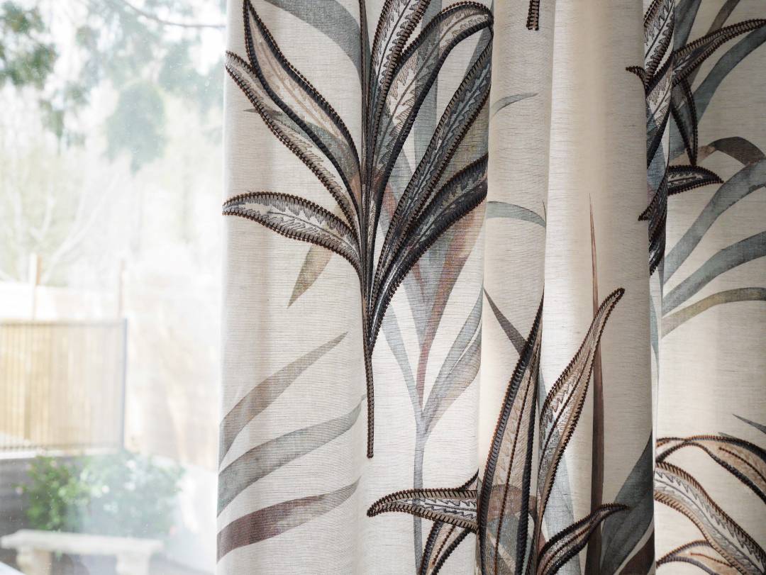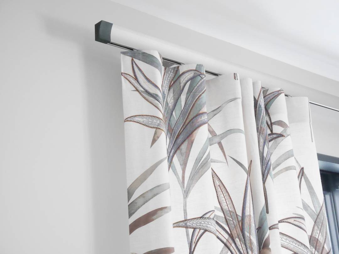 Décoration d'un salon : sol PVC, revêtement mural en écorce de bananier, rideaux imprimés et brodés confection wave sur tringle incruvé
