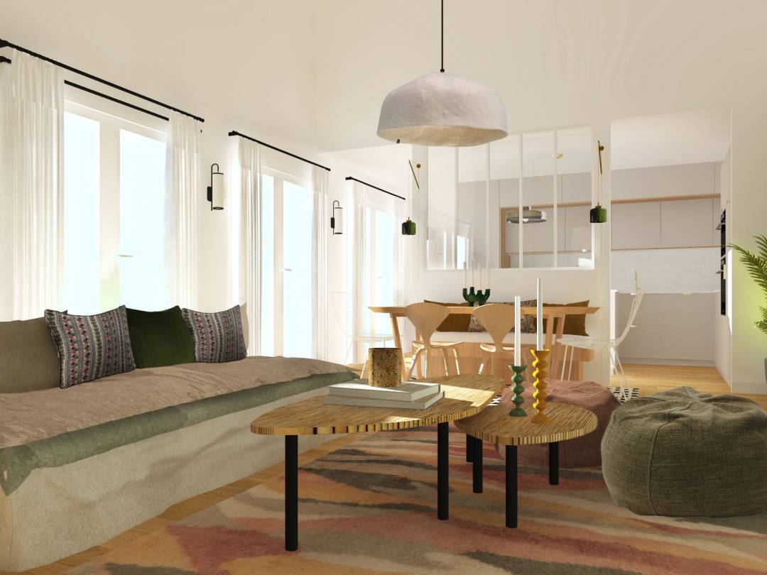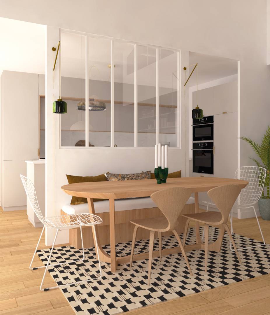 Agencement, aménagement et décoration d'un appartement acheté en Vefa, livré courant 2024. Nous avons revu l'inbtégralité du plan. Ici on recherche l'espace, la convivialité et la lumière. Coloré, fonctionnel, ludique et aérien, ce grand espace a été dessiné pour accueillir une grande famille.