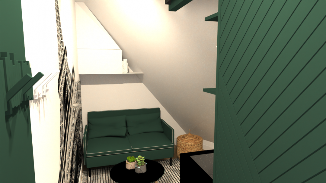 Malgré les contraintes de l'espace restreint de seulement 7m2 au sol et de la mansarde qui occupe une grande partie de la surface, nous sommes déterminés à créer un espace accueillant, fonctionnel, charmant et polyvalent. Avec sa vue imprenable sur la Tour Eiffel et sa luminosité, cette chambre de bonne promet d'être un véritable joyau original à la location !
