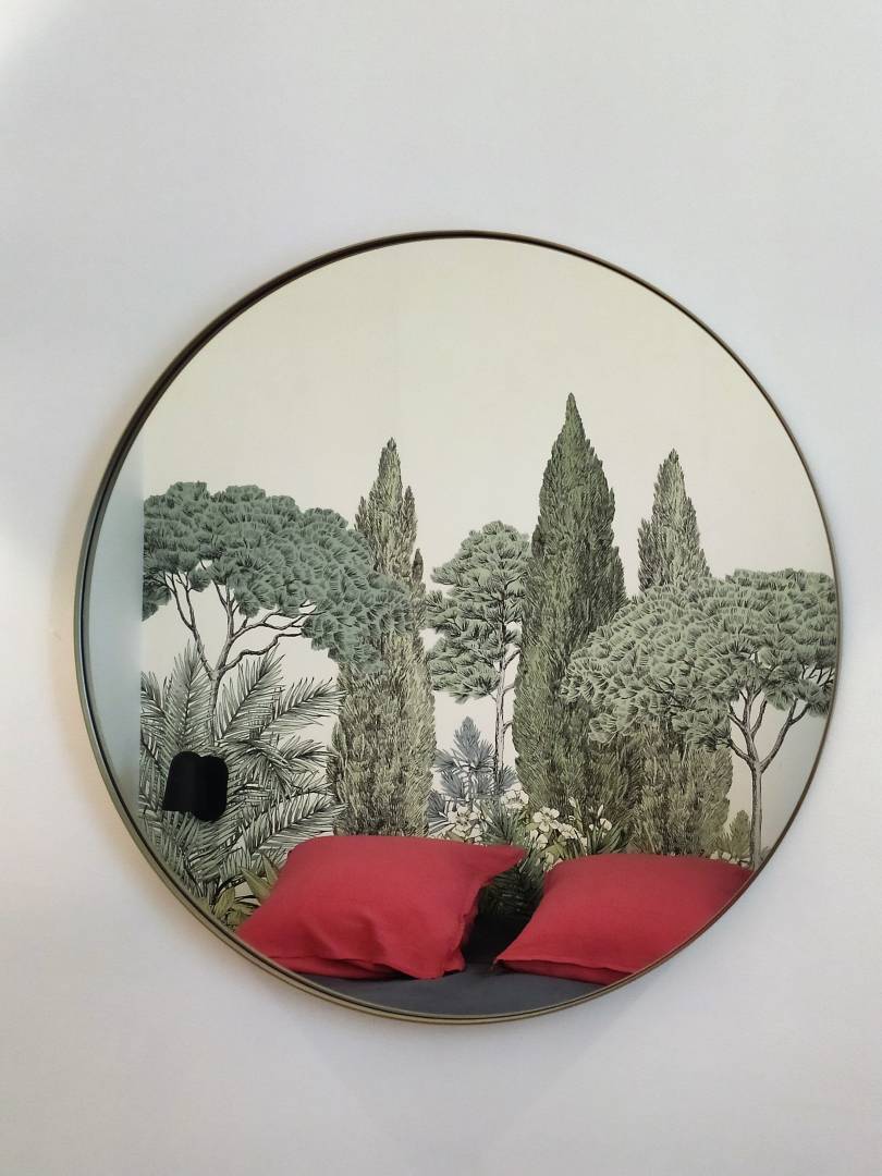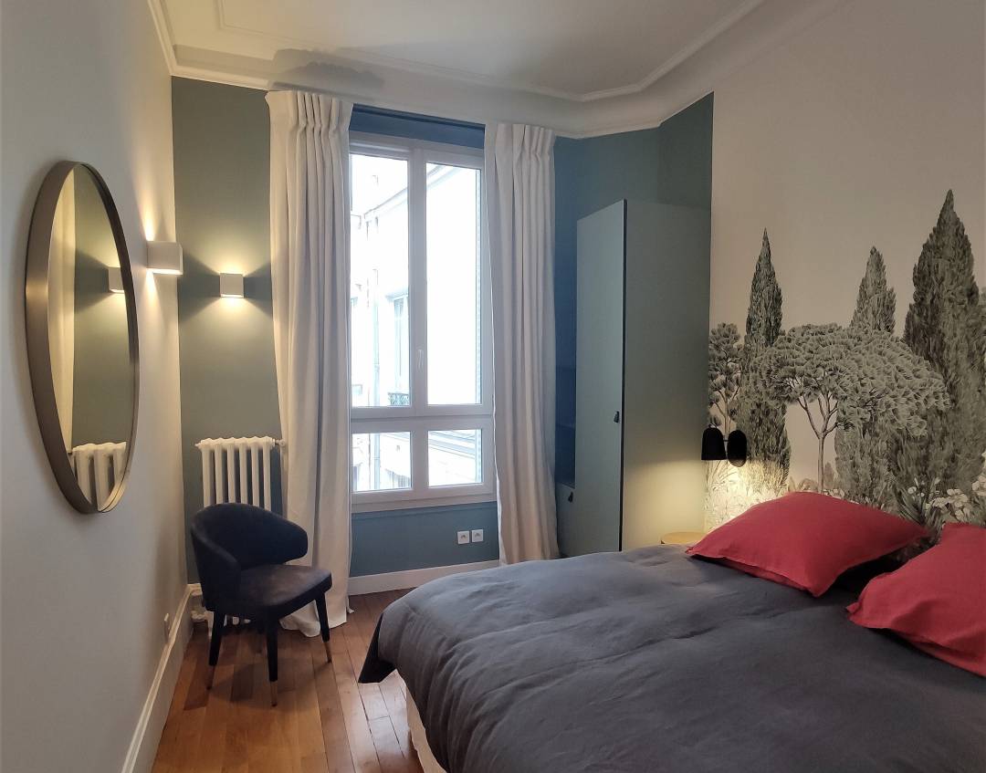 Côté déco un papier panoramique évoquant la Toscane a été choisi dans un dégradé de verts, repris par une peinture vert amande sur la colonne et sur deux pans de murs.
