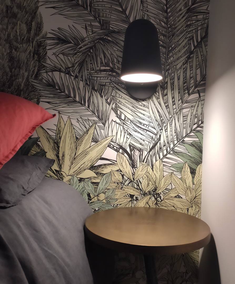Des appliques murales noires ont été choisies en écho au chats noirs des meubles et ce, pour le côté chic.