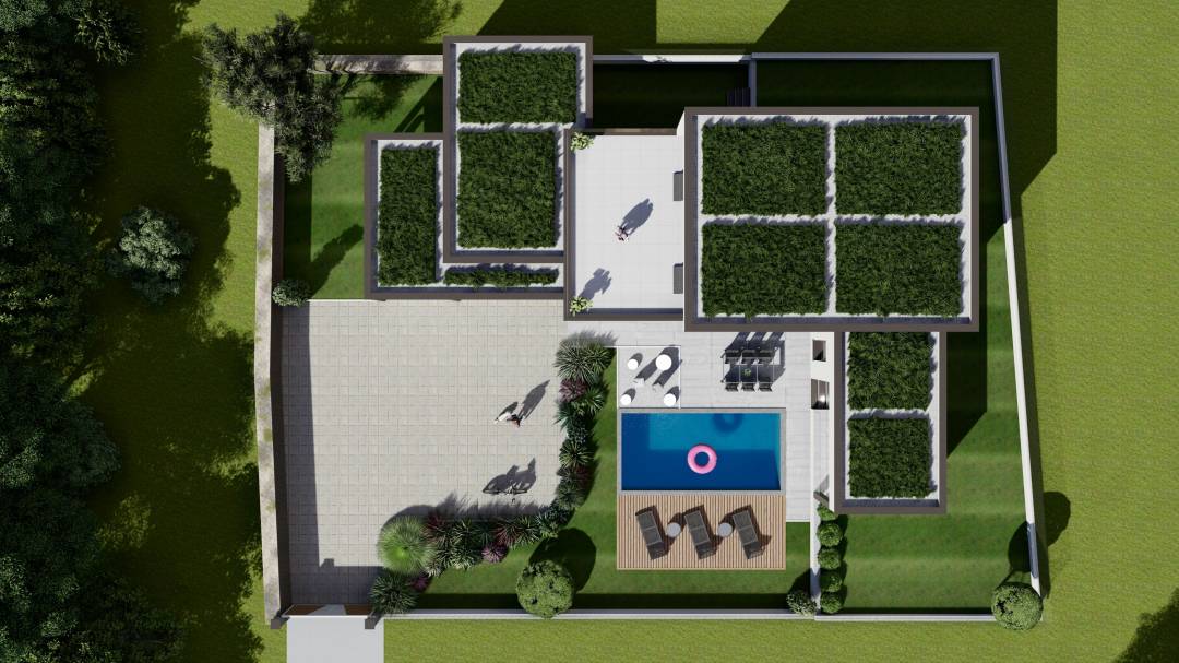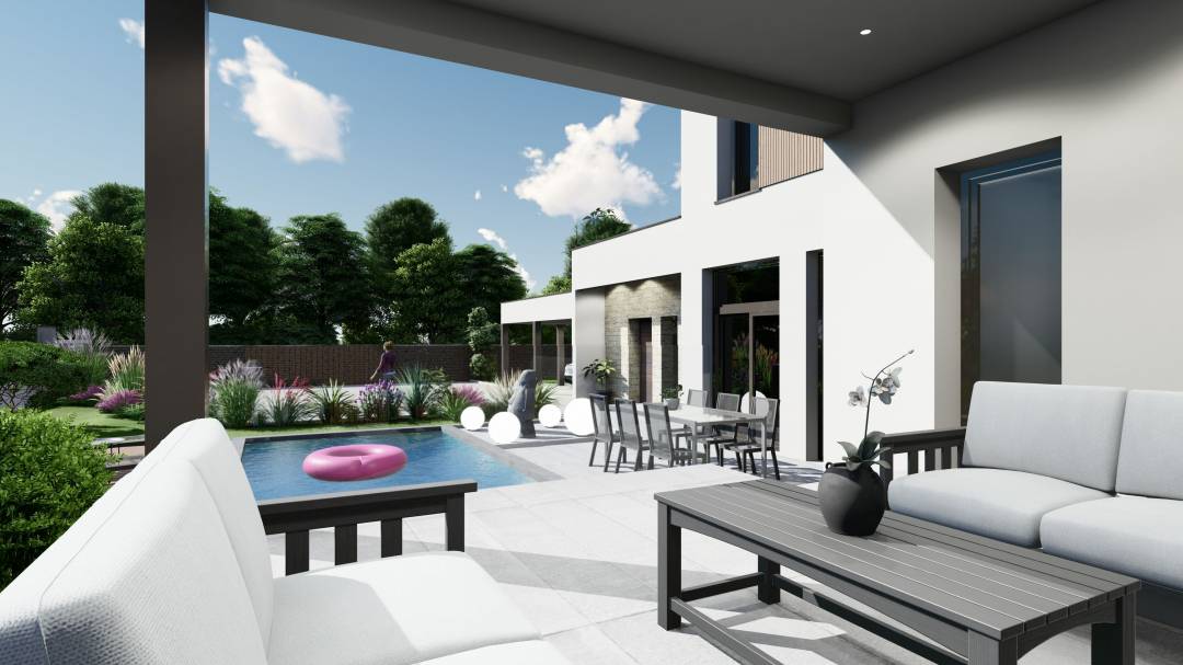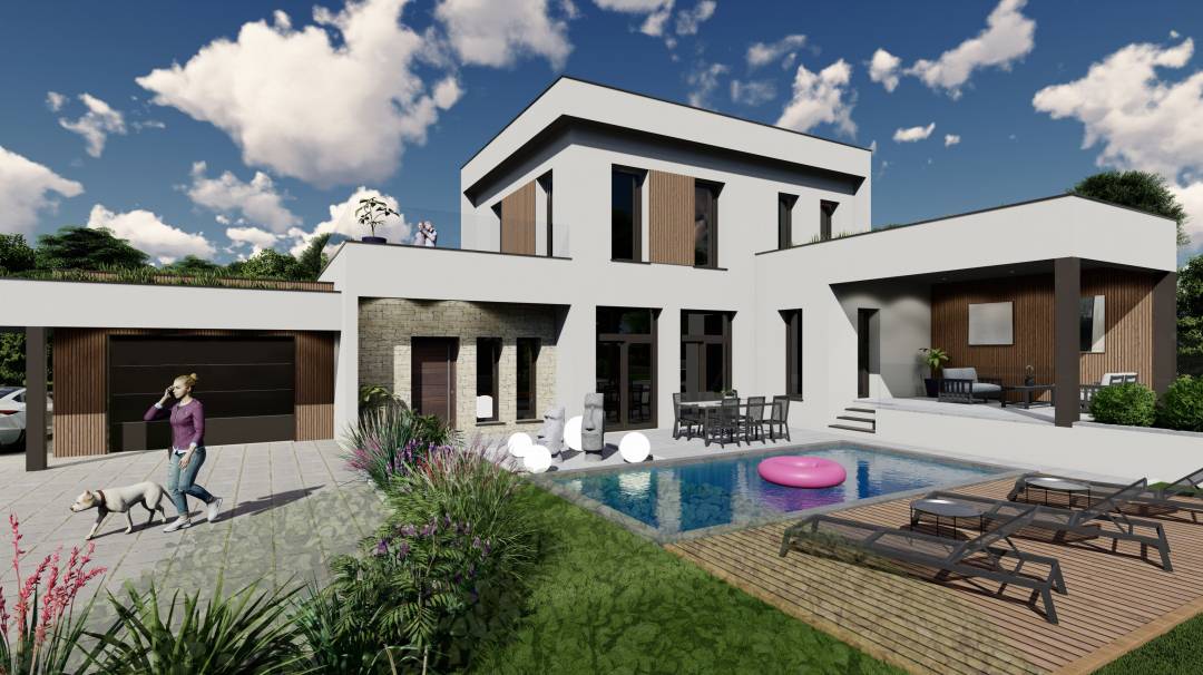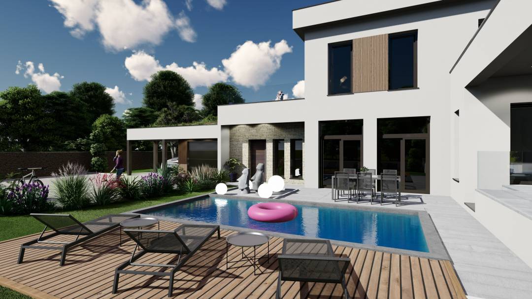 [ VILLA PRESTIGE ] Permis de construire accordé pour cette élégante villa contemporaine de type R+1, dessinée par l’agence en fin d’année 2022. - 125 m2 habitable - 40 m2 de garage - Piscine de 7 x 3.50 m Toitures plates vegetalisées intégrales, hormis la grande terrasse accessible au devant de deux chambres à l’étage Projet situé sur un terrain de 735 m2, composé en 2 paliers.