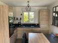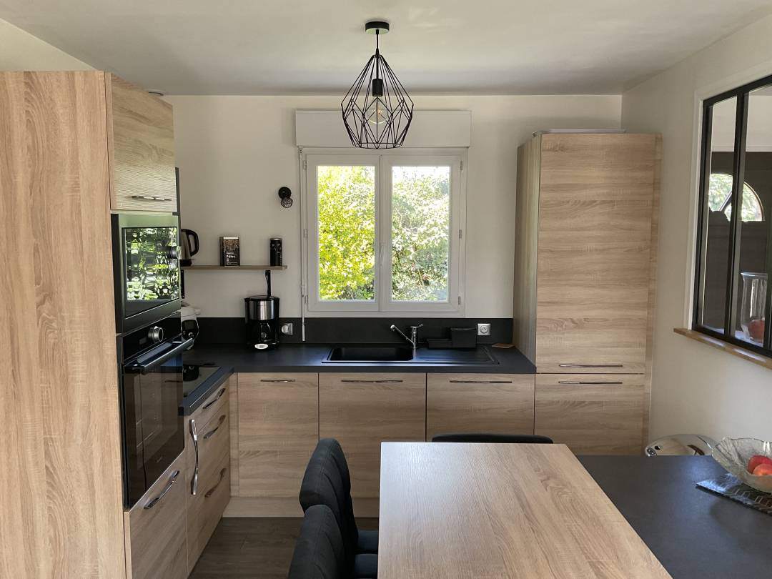 Pour la rénovation de leur maison, mes clients m’ont sollicité pour l’agencement de leur cuisine d’environ 15m², dans laquelle ils aspiraient à un aménagement fonctionnel, intégrant un coin repas et une décoration contemporaine. J’ai entièrement repensé l’agencement de la pièce afin d’offrir un espace suffisant pour accueillir une cuisine aménagée et un coin repas. J’ai opté pour un modèle de cuisine en bois chêne clair. Les éléments associés à un plan de travail et une crédence de couleur noire s’harmonisent parfaitement. Le coin repas autour de l’îlot avec ses assises noires crée une ambiance conviviale. Pour l’éclairage, j’ai préconisé une suspension et des appliques filaires noires afin de se restaurer et cuisiner agréablement. La porte donnant accès à l’arrière cuisine devient une porte en bois chêne clair, et j’ai choisi de recouvrir les piliers avec des pierres de parement couleur gris anthracite. Des accessoires et ustensiles noirs viennent peaufiner la décoration. L’installation de la verrière apporte la touche finale au design contemporain désiré, rendant cette cuisine juste sublime !