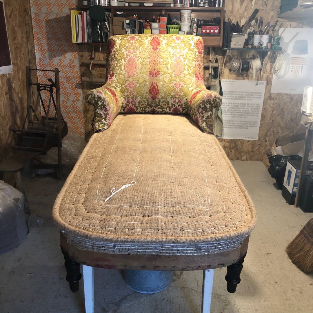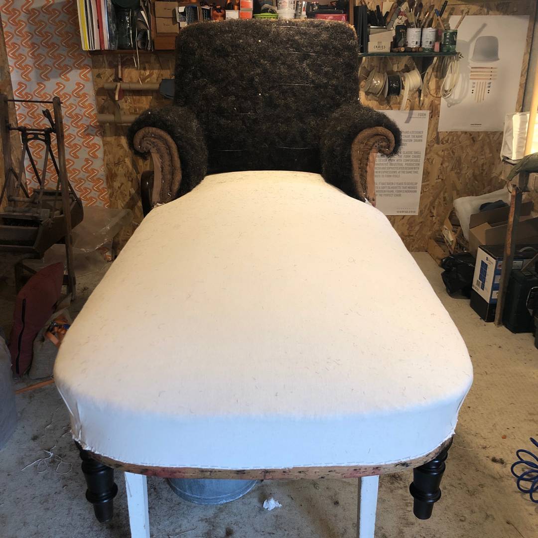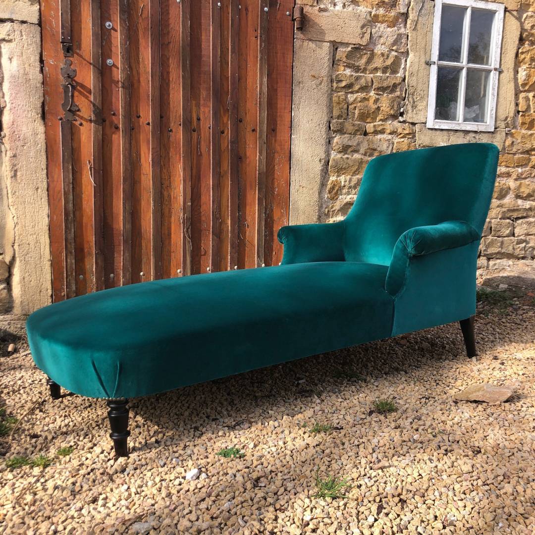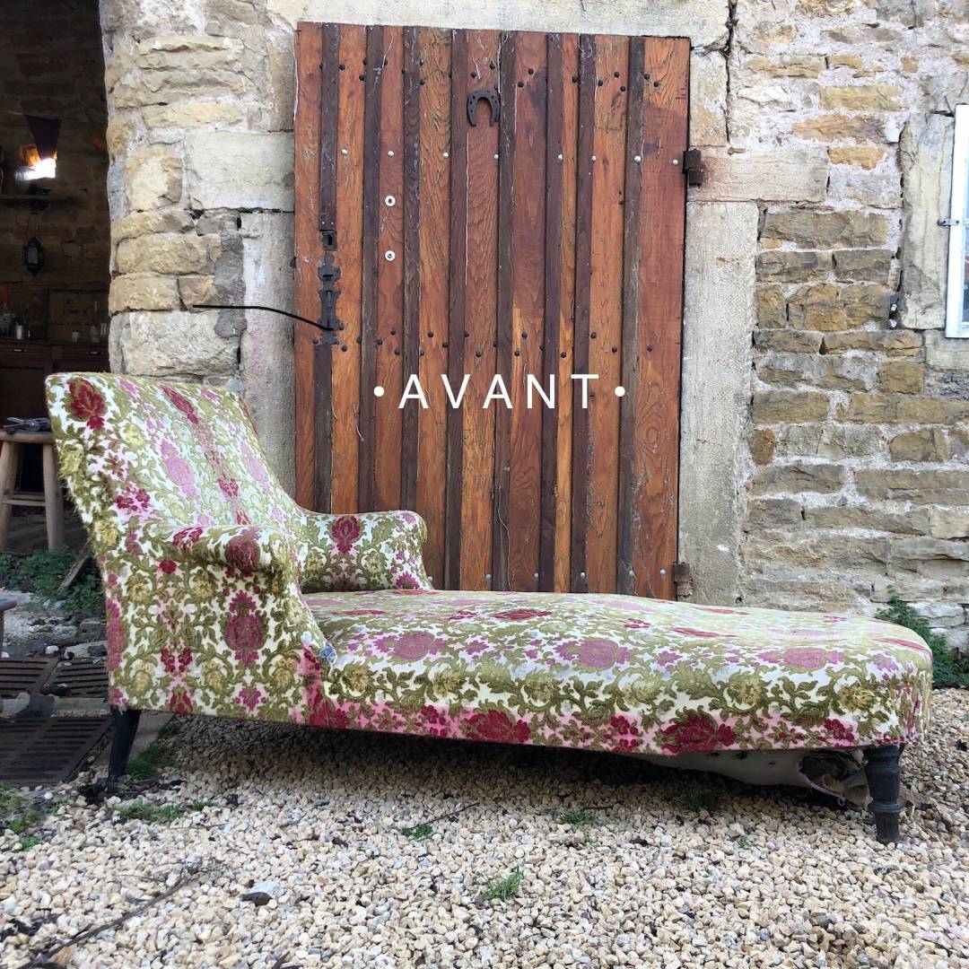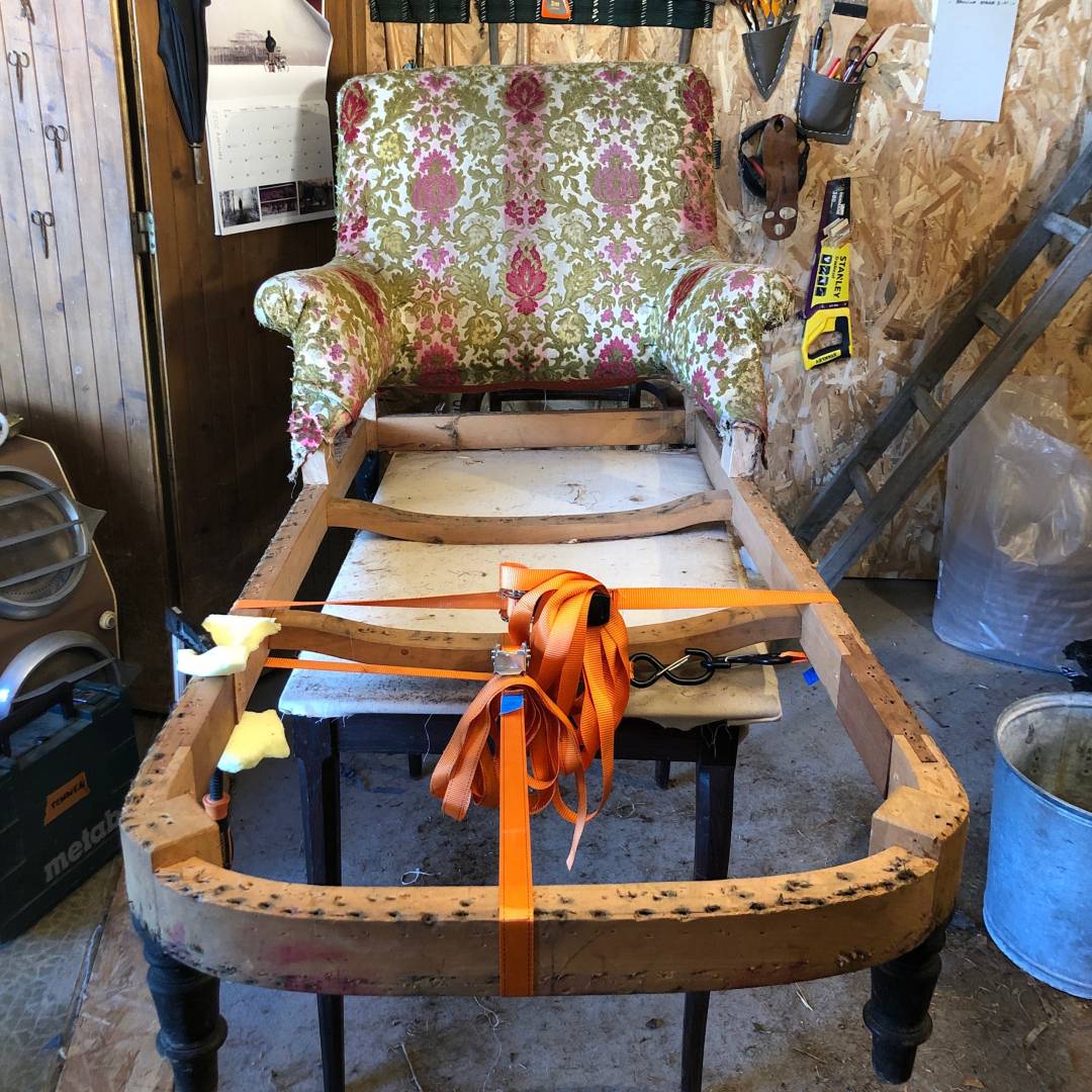 Structure bois à réparer et rénovation de l'assise en garniture traditionnelle. Retouche de la garniture traditionnelle du dossier et les accoudoirs. Revêtement en velours CASAMANCE bleu canard choisi par ma cliente.