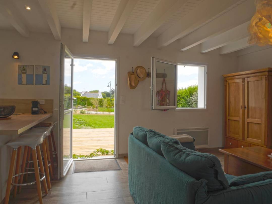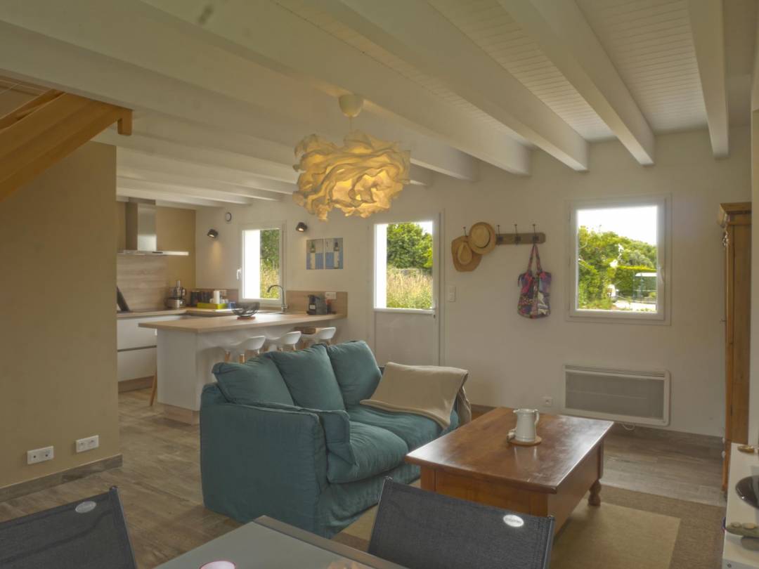 La rénovation complète de cette petite maison belliloise est le fruit d’une collaboration entre un maître d’œuvre local et notre agence. Nous avons retravaillé les volumes pour créer un espace ouvert et lumineux autour de l’îlot central de la cuisine. Les poutres et le lambris, au plafond, de couleur blanche, font référence aux maisons de pêcheurs de cette île de Bretagne. La peinture « sable », sur certains murs de la pièce principale, capte les rayons du soleil en toute saison et rappelle la couleur du sable des plages de cette île, à marée basse. Cette petite belliloise, destinée à la location saisonnière se veut conviviale, chaleureuse et astucieuse pour accueillir ses hôtes et leur offrir des moments sereins et joyeux.