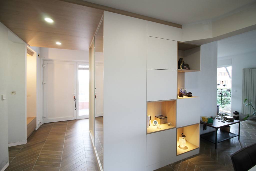 Ouverture du mur porteur, amène plus de luminosité dans l'entré et la nouvelle cuisine, on a pu intégré un meuble sur mesure pour relier les différants espace