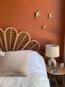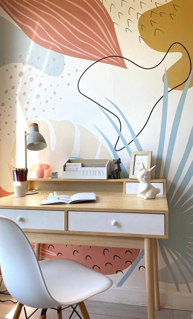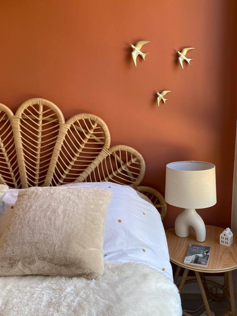De nouvelles chambres pour cet appartement familial.  Le mur de la chambre parentale a été peint pour apporter du relief et de la chaleur à la pièce qui était toute blanche initialement. Les courbes du rotin et les coussins apportent du confort à la chambre, et la touche de laiton des hirondelles illumine l'ensemble. Coup de projecteur sur le coin bureau de la chambre d'enfant avec un papier peint aux formes organiques et colorées qui apportent la touche déco. Un coin lecture avec des matières douces a été imaginé à proximité de la bibliothèque.